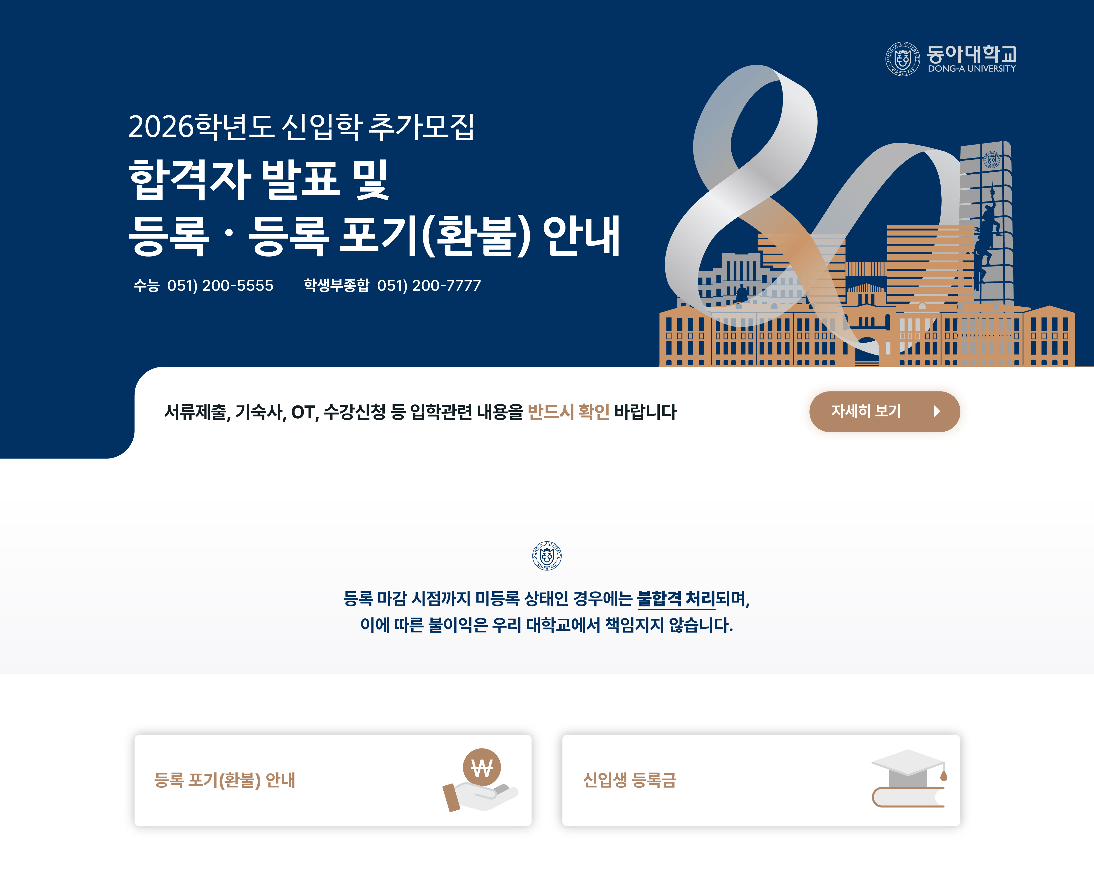 예비합격 후보자는 연락처 변경이나 장기간 출타 시에는 반드시 입학관리과(☎051-200-5555)로 전화바랍니다. |